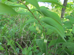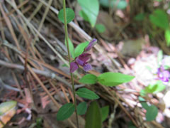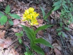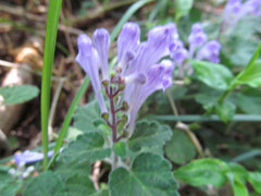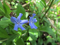 藤野15名山の標識がある山頂に出る。山頂の一部が伐採されて空は開けているが周りは樹林の壁で展望は無し。水分補給で小休止後山頂を後にする。与瀬神社からの登山道と合わさり直ぐに巻路と合流。今回も此処でキンランの花を見られる。姫谷と美女谷を結ぶ続く林道を横切って明王峠目指して登る所でホタルカズラの青い花を今回も見られる。
