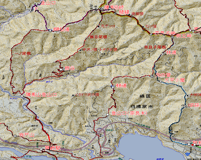 一ノ尾根を落合迄降る登山者が数名居たが陣馬山頂きの賑わいは何処に消えて行くのか?落合迄降ると臨時のバスが待機していて発車まで10分ほど時間があるので此のまま歩いて藤野駅まで行く。トンネルの手前でバスに抜かれたが急ぐ事も無いので歩き始めた藤野駅まで歩いて戻る。今回の山歩きで陣馬山の全登山コースを歩けた達成感に満足しながら帰路を辿る。