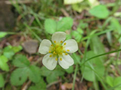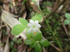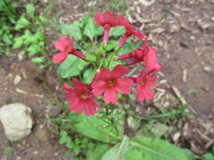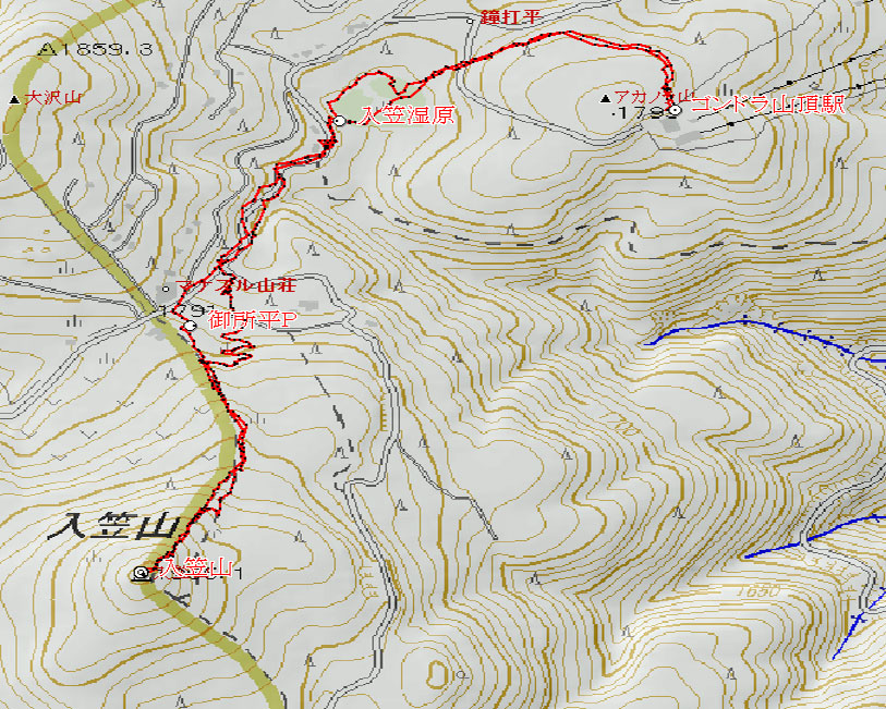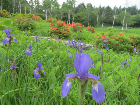 山頂で休憩後、下山は御所平のお花畑の中をジグザグに作られたチップの敷きつめた登山道を花を眺めながら降る。御所平から入笠湿原までの登山道の周りには赤色のクリンソウが多く咲いていて非常に目立つ。対照的に小さな白いスダヤクシュも多く見られる。入笠湿原を回り樹林帯の中を僅かに登って行きゴンドラ山頂駅まで行く。