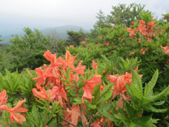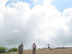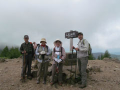 御所平のお花畑は鹿等の食害から保護する為高さ2m程のネットで囲ってある。ネットに沿って唐松の林の中を登って行く。足下にはオオヤマフスマ、ツマトリソウ、イチヤクソウ、シロバナヘビイチゴ等多く咲いていて鮮やかな朱色のレンゲツツジも多く見られる。30分ほどの登りで360度の展望が広がる山頂に出る。時折青空も見えるが南アルプスや中央アルプスの遠望は無し