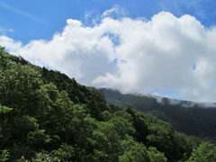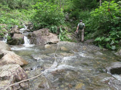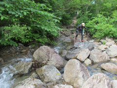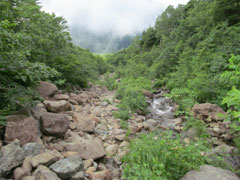 盛岡駅7:10発大迫(おおはさま)経由、岳⇒河原坊⇒小田越⇒荒川行き直通バスで河原坊にて下車。降車したのは3名で後は全員小田越迄行く様だ。素早く準備をしてコメガモリ沢に入って行き前日の雨で増水した沢を石伝いに5回ほど渡る。沢沿いの登山道と言うより沢を山頂目指して一直線に登っている様な感じでゴーゴーと沢を流れる水音が響き渡る。