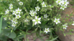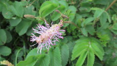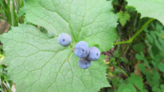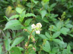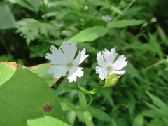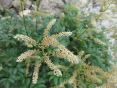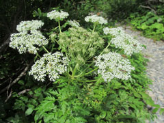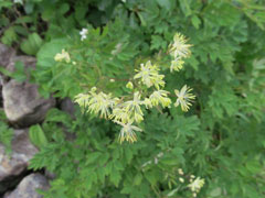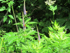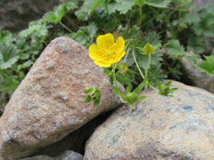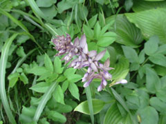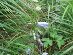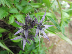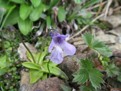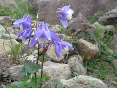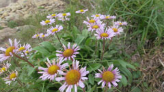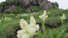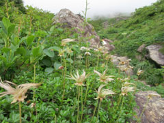 天候は晴れだが雲も多く時折直射日光に当たるが雲で遮られる時が多いのと沢を吹き上げる涼風が快い。水分補給も何度か繰り返して頭垢離(こうべごうり)30の標識(1360m付近)を過ぎると沢の流れは無くなり大きな岩が現れてくる。此の当たりから高山植物のハヤチネウスユキソウ、ナンブトラノオ、ミヤマオダマキ、ミネウスユキソウ等が至る所で見られて心身共に癒される。