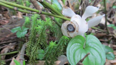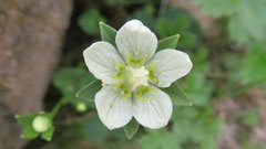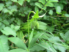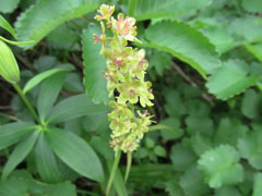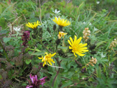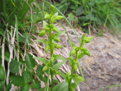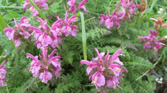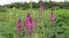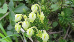 山頂直下のお花畑(コバイケイソウ、イワカガミ、ハクサンチドリ、ミヤマシオガマ、ヨツバシオガマ、アオノツガザクラ等の咲く)の中を一人ルンルン気分で降って行く途中で何度も立ち止まり花にカメラを向ける。更に行くとハクサンチドリやシオガマギク等が群生する所にベンチがあり此処で一人しばし至福の時を味わう。