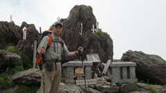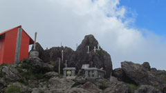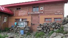 14:15分早池峰山山頂に辿り着く。周りを見回したが人影は無く少々途惑う。鶏頭山方面に僅かに行って見たが人影は無し山頂に戻ると此れから河原坊に降る登山者が一人居たのでカメラのシャッターを押してもらう(記念撮影)。避難小屋も覗いて見たが誰もいない?。後で解った事だが小田越の最終バスが16:30分なので、この時間に山頂に居たら最終バスに間に合わない事で泊まる登山者もいない事だった。