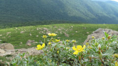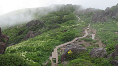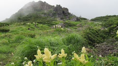 歩き始めは非常に苦しく山頂まで行けるか不安もあったが次第に体も馴染んで来て超スローペースだが山頂が近くに迫ってくる。スローペースの影響で登山道の周りに咲く多くの高山植物も見る事が出来る。此処を河原坊に向かって降る登山者は足元の注意が必要で周りの植物や景色をゆっくり眺める余裕はなく降って行く。