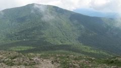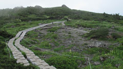 鉄製の階段も余裕たっぷりで降りハヤチネウスユキソウも至る所で見る事が出来て歩行も自然にスローダウン。遮る者が無い草原状の真ん中を緩やかに降って行く目前には明日登る薬師岳が大きな姿を見せている。五合目の御金蔵(四角の岩)を過ぎてのんびり降って行くと小田越登山口の管理小屋も見えて来て前方に登山者の姿も見えてくる。