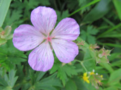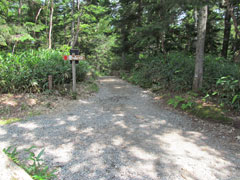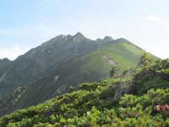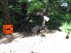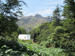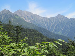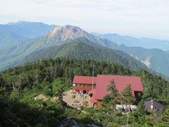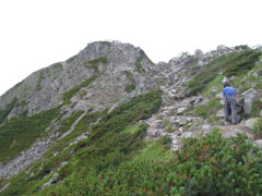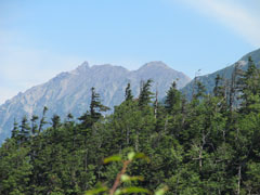 西穂山荘に8時戻る。この先、焼岳小屋までの間は尾根筋の道で水場は無いとの事なので山荘で水を補給して(500m)焼岳を目指す。針葉樹林の中を降って行くと左手に上高地の分岐が有り、焼岳方面に直進し降って行く。降りきると左下方に「きぬがさ池」が見えるが池に降る道は無し。樹林帯の中で展望は無いが直射日光は遮られて暑さはしのげる。