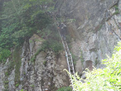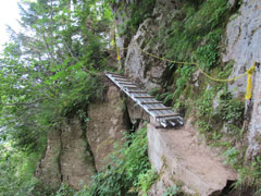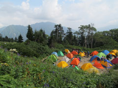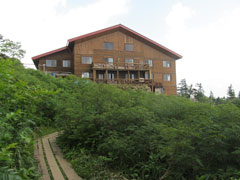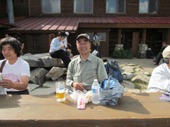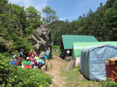 割谷山の巻道を通過中に男性登山者とすれ違う。暫く行くと笹が刈取られていて歩き易くなり大きな岩の有る変化に富んだ急な降りで若い男女6名の登山者と行き交い降りきると新中尾峠に立つ焼岳山荘に到着する。子供も含めて20名ほどの登山者が休憩していて気がほぐれる。ビールが飲みたい所がが未だ先が長く梯子の下りもあるので炭酸ジュースで休憩にする。