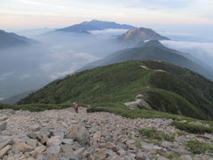 18日快晴。昨夜は蒸し暑いのとイビキで眠れず一度外に出ると満天の星空を見られる。体を冷やしてから部屋に戻り横になったが熟睡できず荷物を纏めて4時に部屋を出て外のテーブルで朝食にする(コーヒーとパン)早朝出発の登山者が数名西穂へ向かって行く。ヘッドランプを用意して薄暗い登山道を独標目指して登り始める。丸山まで昨日登って本日目指す独標を見ているので気も楽だ。丸山山頂からは雲海に浮ぶ笠が岳が見られる。