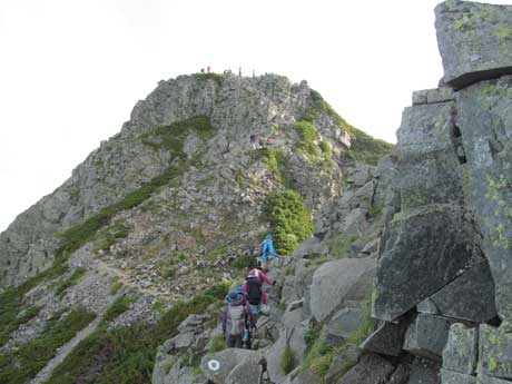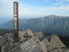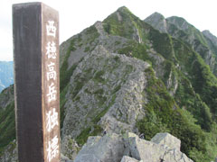 西穂高は奥穂高から南に派生する鋸の歯の様な稜線の総称で主峰の西穂高2909mミラミッドピーク、独標2701m11峰の表示があり。丸山からはガレ場を登り詰めて岩場の小さなピークを回り越して20m程岩場をよじ登ると西穂独標(台形状山頂)2701mに辿り着く。