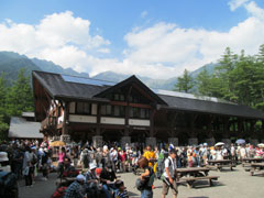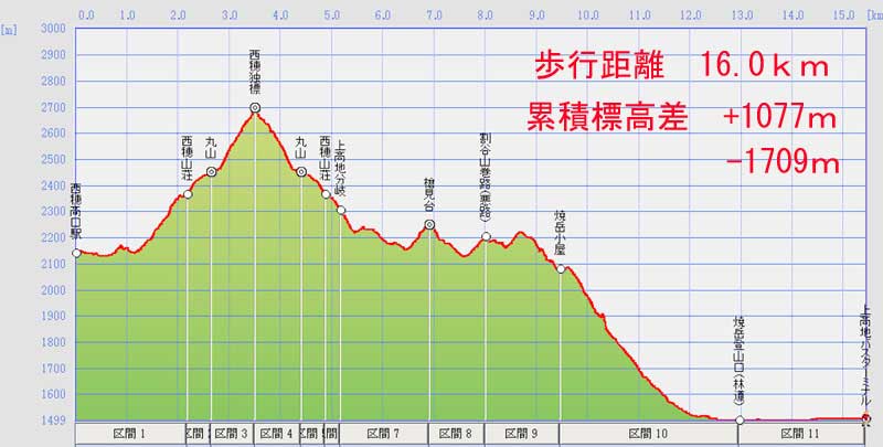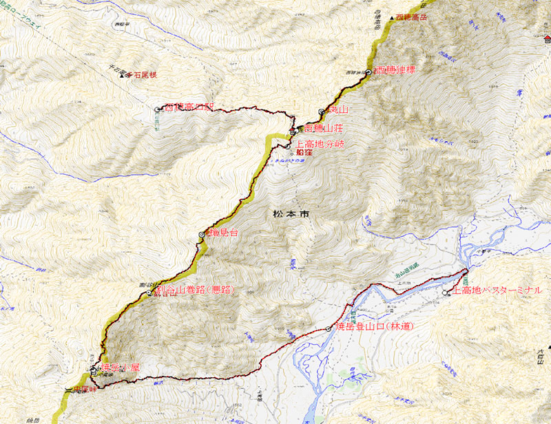 八王子駅⇒松本⇒新穂高⇒西穂高口駅13:14→15:00西穂山荘泊)4:40→西穂独標6:00→西穂山荘8:10→槍見台9:40→新中尾峠(焼岳小屋)12:00→焼岳登山口(林道)14:20→河童橋→上高地バスターミナル14:55⇒新島々⇒松本18:36⇒八王子