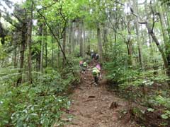 今回は和田峠方面に林道を歩き途中から左手の登山道に入る。新ハイキングコースの標識があるコースを陣馬山まで辿る。実際に歩いてみると結構急斜面の登りが続き予想以上にキツイ標高差500m以上あるので自然とスローペースになる。途中明るい広葉樹林帯もあり幾分気もまぎれる。