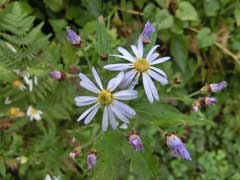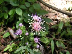団体さんと混ざって陣馬山頂に到着。ガスが濃く視界は悪いので一息入れてから山頂の周りを歩いてみる小さなセンブリが至る所で見られるのと菊類と薊が多い。昼食の時間には少々早いので明王峠に向かう。明王峠に着いた頃から青空が見えてきて陽射しが射してくる。此処で昼食を摂り30分ほど休憩する。