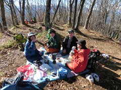 山頂で記念撮影後本日の一番の楽しみの昼食(宴会)先ずはビールで乾杯(大菩薩嶺では5段に昇段そして今回は県大会優勝のAさんの連続祝杯となる)運転者は当然ノンアルコールだが山頂での味は格別おいしい。特製おにぎり、お団子、マイタケのてんぷら、から揚げ、トン汁...e.t.c。
