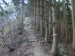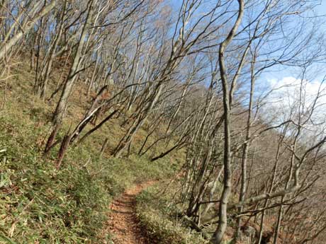 山頂は寒いが幸い風が無く、素早くお湯を沸かして用意して来たトン汁とおにぎり、パン等の昼食を楽しむ..最後は暖かいコーヒーが非常においしく感じる。この時期は一輪の花にも触れる事が出来ず春を待ち望むのみ、期待した笑顔の富士山も見えず寒々した樹林帯の道では青空の明るさが身に沁みる。