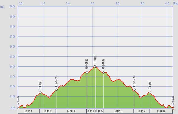 オオダワ9:40→梢口山10:13→クロノ尾山10:40→避難小屋11:27→御前山11:45〜12:50→クロノ尾山13:34→オオダワ14:20