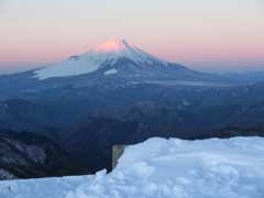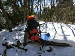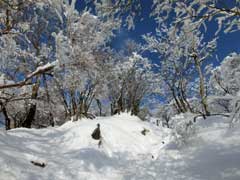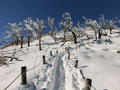 アイゼンとスパッツを装備して、予定どうり7:10分蛭が岳を目指す。霧氷と足元の純白な新雪の登山道を降って行く。無線機の準備をするとタイミング良く昨日と同様にフレンド局のOAO局と交信できる。日高を越して竜が馬場のピークを越して丹沢山の登りに取り掛かり息を弾ませて昨年お世話になったみやま山荘がある丹沢山に出る。