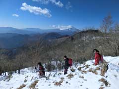 不動の峰を越して棚沢の頭を越えて鬼が岩の所で急斜面を降る前に一息入れて記念撮影。富士山の展望、蛭が岳から左手に大室山、檜洞丸が目前に見える。距離は僅かだが急斜面なので慎重に下る、鎖があるが雪に埋もれて隠れている。降った所で静岡から来られた健脚の男性2名が蛭が岳から引き返して来た。檜洞丸に行く予定だがトレースが無いので諦めたと言って行き交う。