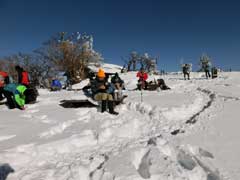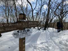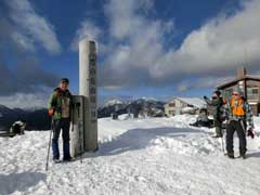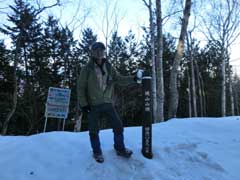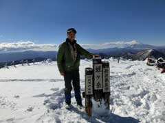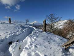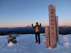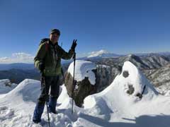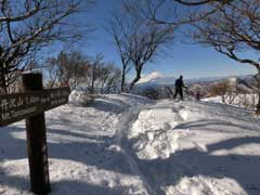 昨年は霧氷が綺麗に見えたが今年は純白の新雪と青空が非常に気持ちよい。昨年お世話になった、みやま山荘によって「おかみ」さんにご挨拶して少々話を交わしてくる。再び丹沢山を急降下して丹沢第二の標高の不動に峰目指して登り返す。東京から来られたグループの男女二人の方と蛭が岳まで前後して同行させて頂き写真を撮って頂いたりする。不動の峰手前の休憩舎で小休止ミカンで喉を潤す。