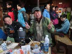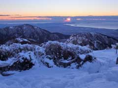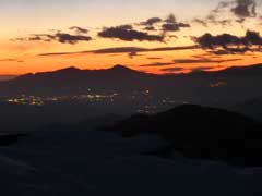 茜色の空が次第に暗くなり街の灯りが輝き始める頃、山小屋では宴会が、鍋の香りが漂う中、山談義に花が咲く。毎年この時期に登って来る4人グループ、静岡から来られた健脚な2名の男性、昨年は丹沢で今回は塔ノ岳と私と3年連続同じで所で泊の東京から来ているグループ等〜近親感を覚える楽しい宴になる。今夜の寝床はゆったりスペースで少々雑音もあったがシュラフに潜り込んで休息できる。