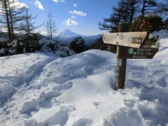 恒例になった年末の丹沢登山、今回は未踏の小丸尾根から登る。大倉バス停から二又まで林道を約一時間歩き二又から小丸尾根に取り掛かる。林道を歩いて行く登山者を数名見かけたが何れも後沢乗越から鍋割山に行くようだ。小丸尾根は尾根筋の明るい登山道で危険な所もなく静かな山歩きが出来る。登るに連れて足下が白くなり富士山の頭が見えて来る頃には10Cm程の積雪になり小丸分岐(稜線)に出ると30〜50Cmの積雪になる。19日〜20日に渡って降った純白の新雪がとても気持ち良い。