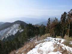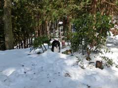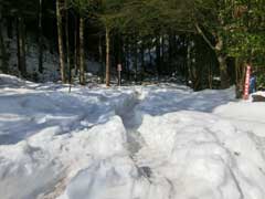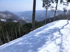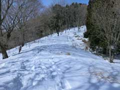 景信山に戻る途中、南側の踏み跡の無い巻路を歩いて行くと雪質がシャーベット状態で何度もスノーシューが60cmほど埋まってしまい巻路を通過するのに体力を通常の倍程度消耗する。景信山に戻り小休止後スノーシューを付けたまま登山口まで降って見る。(雪山スノーシューハイク)