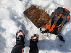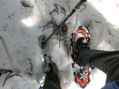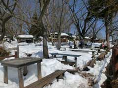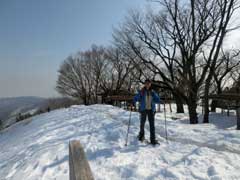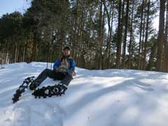 一筋のトレース(溝)を辿り小仏峠から景信山に登る。陽当たりの良い南側はテーブル、ベンチが見えて居たが反対側は未だテーブルが見えない程の積雪があり、僅かに露出しているテーブルに腰を下ろして軽い食事にする、食後早速スノーシューを付けて歩いてみる。雪質も表面が凍っていて3cmほど沈むが快いクッションになり快適に歩く事が出来る。