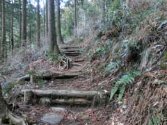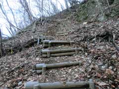 再び降って行くとダムが真下に見える広場があり正面にモヒカン刈りの南山と対峙する。此処も見晴らしが良いのでベンチが設置されている。此処からは急斜面の階段が登山口まで続き、登山口に辿り着いた時はホッとする。