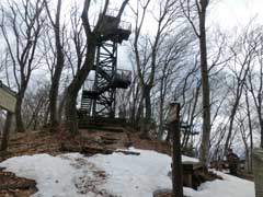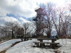 残雪の有る急斜面を登り詰めて標高747mの仏果山山頂に到着。久しぶりなので展望塔に登って見る一人先客の方がいてしばらく山の話(各所の情報)に時間を費やす。塔を降りて昼食にしていると次第に登山者が集まって来て多くあるベンチも昼食を摂る方たちで満席状態になる。