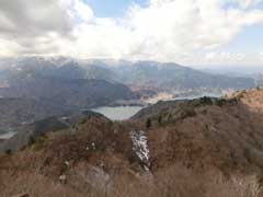時間の余裕があるので今日はダムサイトに降るコースを利用する。高取山からは一端降って登り返す間は痩せ尾根で注意しながら確実に足を運び通過する。その後は緩やかな明るい尾根筋を降って行き展望が大きく広がる見晴らし台に出る。湖の後方には蛭が岳から続く長い尾根の先端の焼山まで正面に見える。