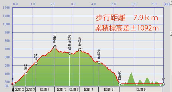 仏果山登山口P→林道→仏果山→高取山→見晴台→宮が瀬ダム登山口→県道214号→仏果山登山口P