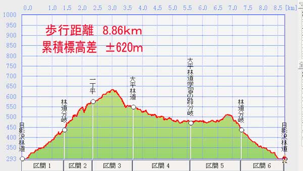 日影沢林道→一丁平→大平林道→学習の路→日影沢林道