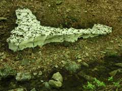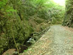 明るく開けた所、両脇に岩壁の迫る所や滝もあり景色を眺めながら楽しく歩ける。一か所沢筋に残雪もあり。ザリクボから2km、左に目指す林道(影信林道?)があり車止めが置いてあるが林道の名称等の標識は見当たらない。
