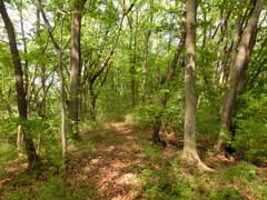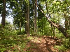 明るく開けた二股に出る。右手は行き止まりの様なので左手に行くと250m程の所で林道は終わりで山道が直進と左右に有り(十字路)右手の尾根道を登って行くと標高655mの(小下沢山?)に出たが展望は無い。薄い踏み跡を辿って僅かに下った所で踏み跡が消えて目の前の急斜面を登って行くと景信山トイレの100m程下の登山道に出る。