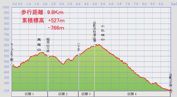 清滝駅⇒ケーブルカー山頂駅→2号路→1号路南側の路→5号路→一丁平→日影沢林道山頂→日影バス停