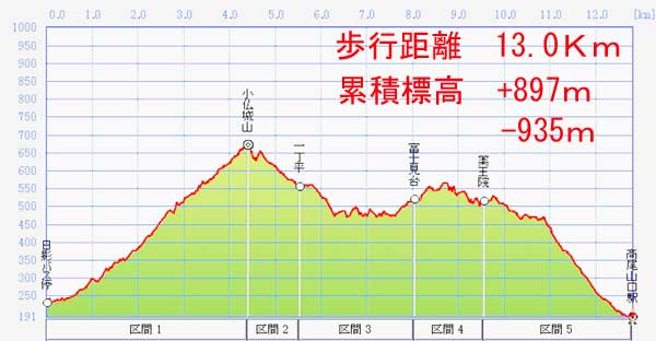 日影バス停→小仏城山→一丁平→富士見台→5号路→薬王院→1号路→高尾山口