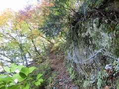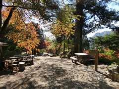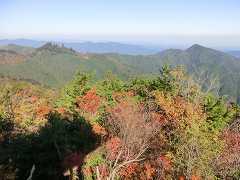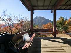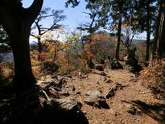 上高岩山の標識の有る山頂を通過して高岩山展望台で昼食にする。名前の様に本日一番の展望が得られる。目前の大岳山の山腹は紅葉の斑模様、御岳山と日の出山の展望も良い。若いご夫婦が息を弾ませながら登って来る。養沢神社からキツイ登りの様子だ。展望台からは急降下がしばらく続き僅かに登ると高岩山山頂の標識があるが展望が無く通過する。植林帯に変わり炭焼き跡を見ながら降り養沢神社に降り着く。バスの時間が有るので国際マス釣り場バス停まで歩き此処でバスに乗り五日市駅に。