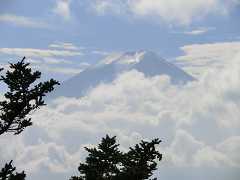 刻々と変化して行く富士山の姿を見ながら特等席での贅沢な一時(昼食)。青空のバックに上層部のすじ雲、中間の白い綿雲が太陽光を反射させながら流れて行き、下層の雲に浮ぶ富士山の姿しばし時を忘れる。