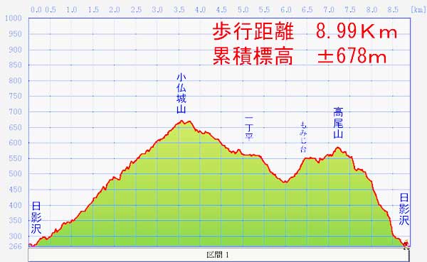 日影沢→小仏城山→一丁平→もみじ台→5号路→いろはの森→日影沢