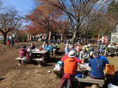 小仏城山山頂に登ってびっくり!!テーブル、ベンチ満席、今年、最高の賑わいだ、早々に昼食を済ませて巻路から一丁平を目指す。小仏城山から高尾山のメイン通路は行き交う人の行列で賑わっている。一丁平の広い場所も団体さん、グループさんで賑やかだ。