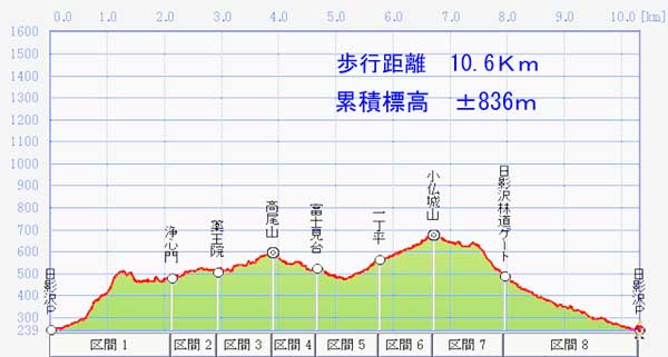 日影沢P→いろはの森→4号路→浄心門→薬王院→高尾山→富士見台→一丁平→小仏城山→日影沢林道ゲート→日影沢P