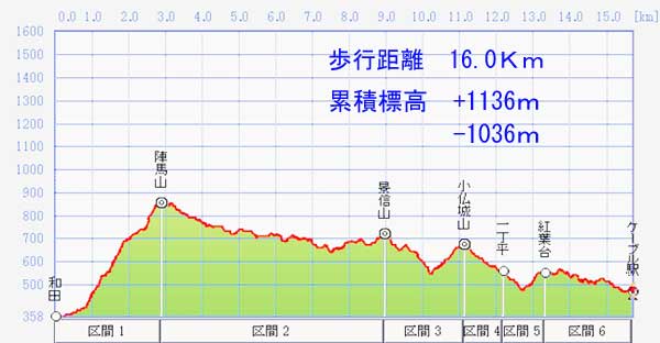 藤野駅⇒和田→和田尾根→一の尾根→陣馬山→明王峠→景信山→小仏城山→一丁平→紅葉台→ケーブル駅⇒高尾山口駅
