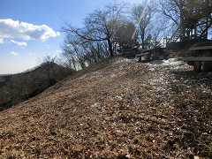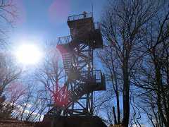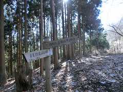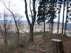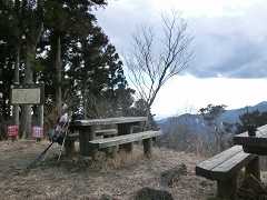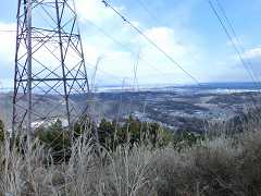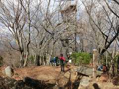 植林帯を抜けて最後の急斜面の登りは凍りついた凸凹の階段になりスリップに注意してゆっくり登り詰めると左手が大きく開けて関東平野が一望できる。早速展望台に登り丹沢の山脈から奥多摩の山々を見渡す。大岳山、御前山、三頭山、権現山、扇山、滝子山...山座同定