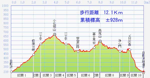 日影沢林道P→萩原作業道→一丁平→小仏城山→一丁平→富士見台→紅葉台→高尾山→浄心門→いろはの森→日影沢林道P