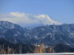 一丁平の巻路に出て僅かに登りトイレ舎(3月まで改修予定?)の裏から一丁平に出る。一丁平は10センチ以上積雪があり一面銀世界。雲一つない青空に真っ白な雪は心が洗われる。早速展望台に行き富士山を見たが残念!、左半分が雲に隠れている。