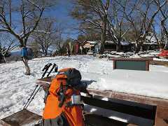 一丁平からは新雪を踏締めて小仏城山迄行く。山頂は15センチほど積雪があり雪山登山を楽しみに来た方が20名ほど休憩している。山頂からは視界も良くスカイツリーも良く見える。少し早いが此処で昼食休憩にする。