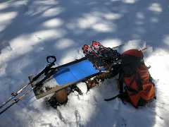 昼食後、小仏城山の巻路を回って一丁平まで戻る。スノーシューを用意して来たので積雪が少ないが試しに一丁平から大平林道まで歩いてみたが積雪が10センチ以下では雪のクッションもなく重さだけが負担になり体力の消耗が多くなる。