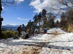 スノーシューを外して軽くなった足取りで大平林道、学習の路を通って富士見台で小休止。雲が移動して富士山のぜんたいが見えて来たので富士見台から急斜面を登り紅葉台に上り富士山の展望を楽しむ。此処紅葉台は日当たりが良く富士山の展望も良いので多くの方が食事や休息している。