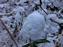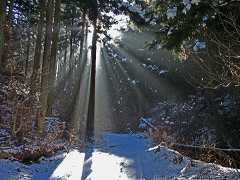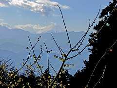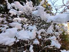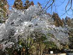 雲が多くなって来て鮮明度も落ちるが未だ富士山も良く見えているので満開の蝋梅の花と富士山の写真を撮ってから巻路を利用して小仏峠に戻り下山する。途中振り返ると枝から落ちる雪の粉に陽光が乱反射して輝く姿で本日の雪山登山の終わりとなる。