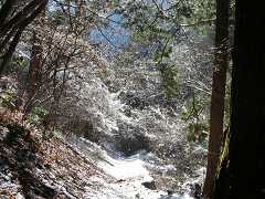 小仏バス停先の林道終点まで行くと既に除雪車の作業が終わっていて先着の車が無し。日当たりの良い所に駐車して枯れ木に雪の花が咲いたトンネルを潜って行くが高い木の枝に積もった雪が時折陽光に当たり溶け始め、塊となって降ってくる。途中で首筋の後ろに直撃を受けてしまい雨用フードを被り山頂を目指す。